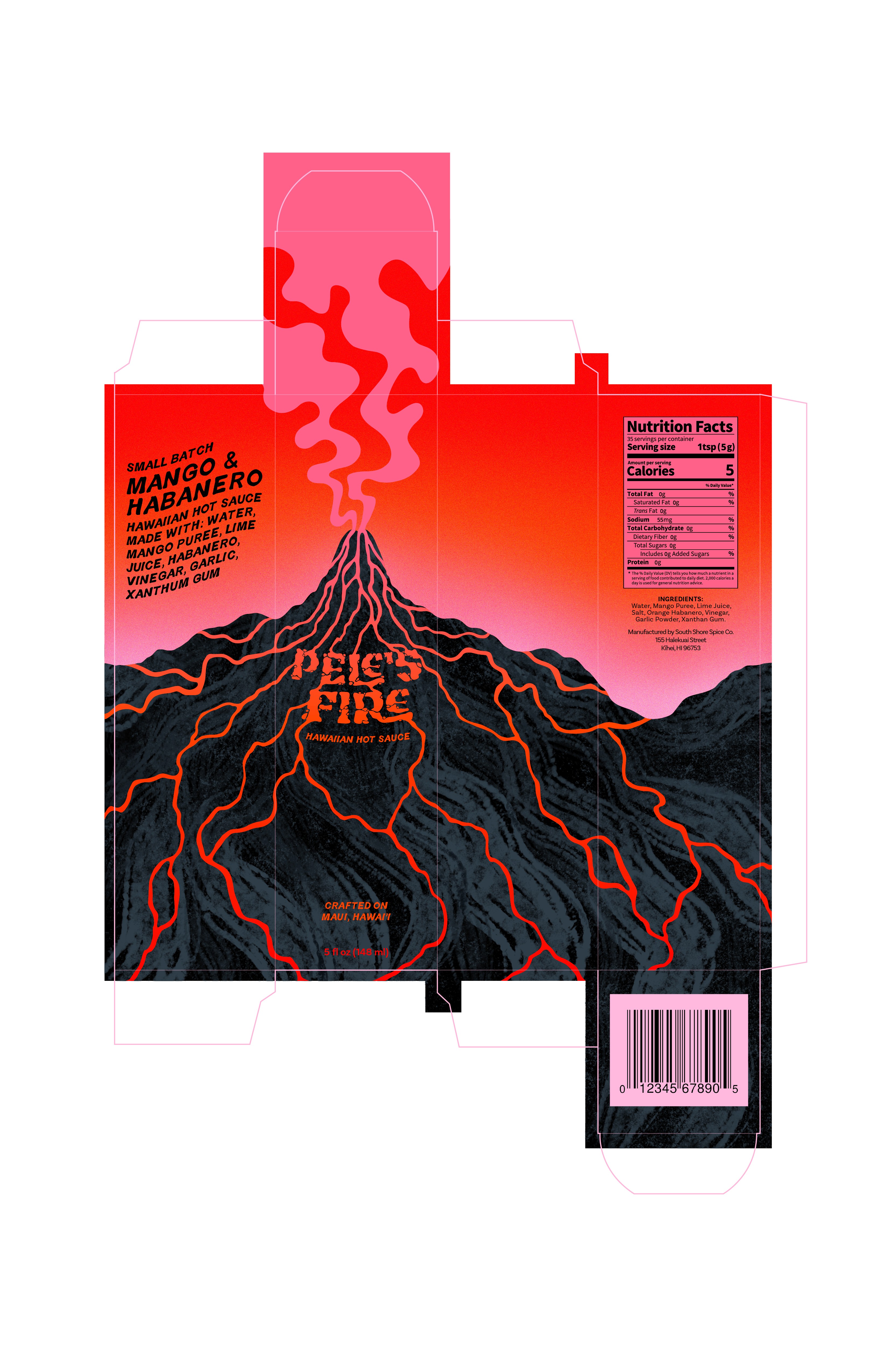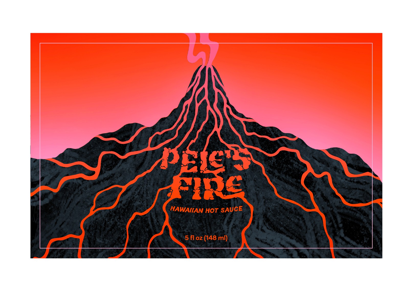 Pele’s Fire is a hot sauce brand and packaging project that required us to create a word mark logo and packaging inspired by our assigned brand name. Pele’s Fire is named after the Hawaiian goddess of fire and volcano’s, and inspired me to make my word mark combining lava rock into a Hawaiian inspired font. The illustration was done to incorporate the word mark and is inspired by the vivid, bold landscape and colors of the Hawaiian islands. My goal was to make Pele’s Fire feel hand crafted, bold, and stand out on the shelf from competitors.